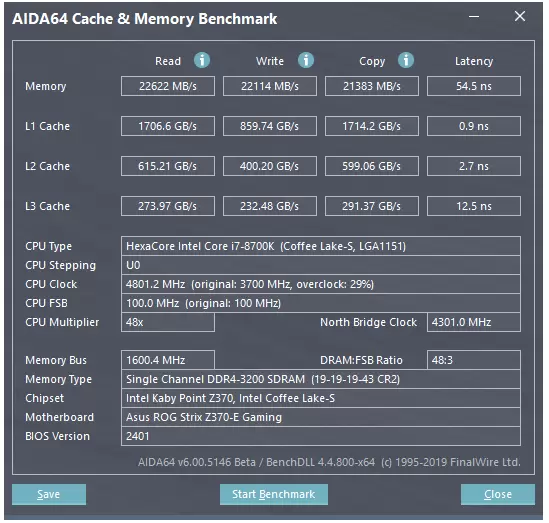 测试平台为平台用的是i7-8700K+华硕ROG STRIX Z370-E GAMING,通过AIDA 64的内存测试看看朗科DDR4 2666内存的理论数据。