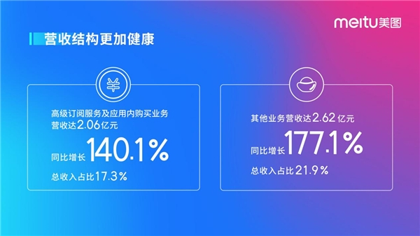 由此可见,美图公司营收结构变得更加健康,在原有广告业务稳步发展的同时,高级订阅服务构成第二增长曲线,新业态催化的第三增长曲线也开始浮现,并逐步成为新的利润增长点。