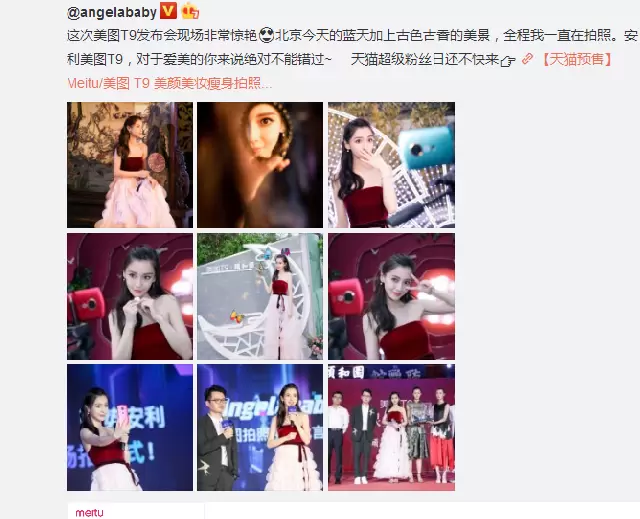 同时,美图手机也为天猫超级粉丝日提供了最大化的品牌营销资源,其一不仅在美图大产品矩阵进行多重资源曝光,其二更有美图手机代言人、美图首席颜值Angelababy在微博为美图T9与天猫超级粉丝日“种草带货”并录制深度定制视频,其三在线下“美图T9大片实验室”活动中联合天猫超级粉丝日在上海、成都、广州开展合作,并在广州、成都两地为天猫用户定向进行新品首发等福利活动,让天猫的忠实用户可以提前就入手美图手机新品,体验更多定制服务活动,不难看出双方利用各大平台的力量进行全媒体投放,在天猫超级粉丝日开始前即进行全线预热,促使双方实现最大限度的品牌曝光。