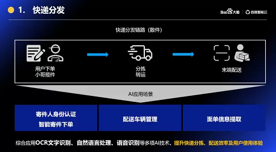 当下,物流行业在一些环节中仍处在劳动密集型阶段,存在诸如快递员短缺、分发低效、配送效率参差不齐等痛点。百度直面企业需求,在深度挖掘物流分发链路及业务场景后,整合提炼出百度AI智慧物流应用方案。据百度智能云AI高级产品经理在活动现场介绍,各类物流企业依托百度大脑多项AI能力,能够全面提升业务链路上各关键环节的自动化、智能化管理水平。例如在快递寄件下单环节,可综合应用百度OCR文字识别、自然语言处理、语音识别等AI技术,自动提取录入图片、语音和长文本中的收件人信息,实现一键智能下单,平均下单时间可从3分钟缩短至15秒;运输配送环节可应用OCR卡证识别能力, 实现运输车辆自动化进出场,提升各转运中心的中转效率,并可快速录入司机及车辆信息,方便进行违章查询、维修保养等服务,提升车辆管理效率;而在末端配送环节,将OCR面单识别能力集成到手机、把枪等手持设备中,快递员直接扫描包裹面单,即可快速提取收/寄件人电话号码、快递单号等关键信息,自动录入系统,既减少输入错误也提升投递效率。