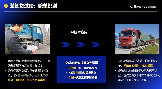 在大宗物流场景中,货运磅单数据核对十分重要,而磅单的版式众多,百度iOCR自定义模板文字识别能够有效应对这一挑战,只需1张单据样张,5分钟即可快速定制识别模板,自动结构化识别各类磅单。司机运输完成过磅后,拍照上传磅单,系统即可自动识别并核对数据,以往手动录入和人工审核要花费5分钟,现在可缩短到1分钟以内。