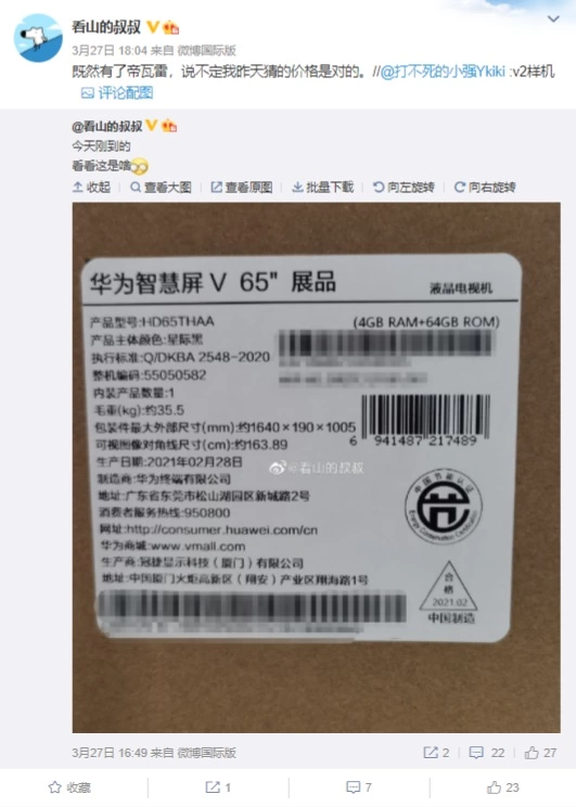 数码博主 @看山的叔叔 店里新到了一款华为尚未发布的智慧屏 V65“ 款,从他发布的图片中来看,该机将拥有 4GB 运存和 64GB 机身存储,尺寸约 1640 x 190 x 1005mm。他还透露,该机支持 120Hz 刷新率,内置帝瓦雷音响。预计售价万元左右。