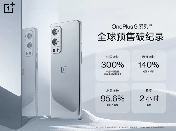 一加 9 系列发布后,市场反应火爆,全球预售当日破多项纪录,其中中国增长300%,一分钟预售量超8系列同期全天。一加 9 系列将在3月30日上午10点在欢太商城、京东商城、天猫旗舰店、苏宁、一加授权门店线上线下全渠道开售,价格3799元起,售后方面一加 9系列将享受两年官方质保服务。