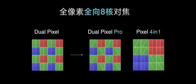同时这个传感器带来了一个全新的对焦技术,小米称之为“全像素全向八核对焦”,三星之前称之为“双像素技术”。它实际上是在传统的全像素对焦的基础上做了改进,将原有的垂直像素排列重新拿出绿色像素做了斜向排列,这样的好处是使得原来垂直排列在极限横向纹理场景不对焦的情况得到改善。
