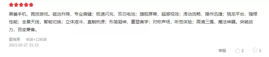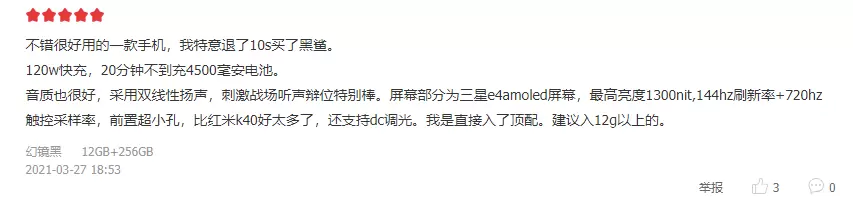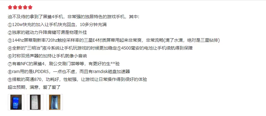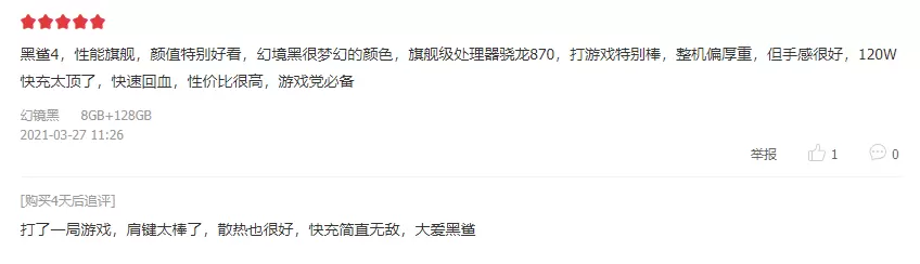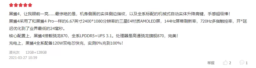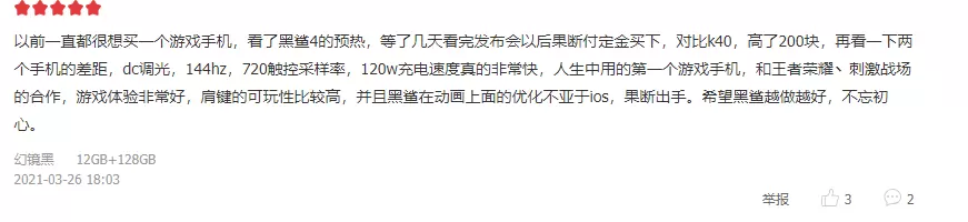 销量突破“天际”的同时,首批收到手机的用户也对黑鲨4系列赞不绝口。“手机很棒,手感很好,黑鲨老粉,下次还会再支持黑鲨 黑鲨加油!”“双肩键很有特点,并且声音极其清脆,玩游戏更是无压力。是我想要的。”“120W的极速闪充太给力了,15分钟就充满了。游戏手机买黑鲨就对了。”每一条评论都是用户对黑鲨4系列的认可,同时也再次展示了黑鲨作为行业顶尖品牌的硬实力。