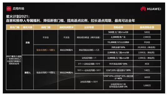 新激励:对于直客和推荐人,星火计划2021划分出不同的激励内容。面向直客,有推广金、Vmall券、华为云优惠券、消耗返利等;面向推荐人,则根据达标应用数为推荐人返还激励金,最高激励金额可达1600万元。通过不同梯度的激励机制,华为应用市场强化了合作伙伴的主体意识,帮助开发者获量的同时,丰富了华为应用市场的生态构建。
