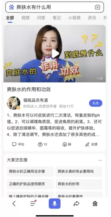 当用户使用百度搜索“爽肤水有什么用”的时候,首条出现的结果就是由百家号作者所创作的视频内容,同时在结果上也将会直接展现作者的主页入口,点击主页进入,可以与该作者进行一对一私信咨询。