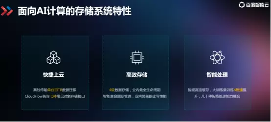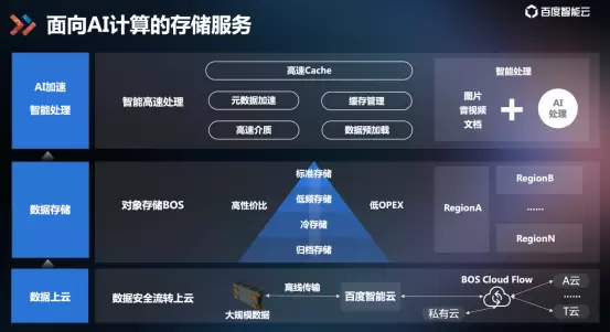 -第三层,就是数据的处理和AI加速层,在加速层面,百度提供一层Cache服务,基于更高速的存储介质,提供元数据加速,缓存的管理等能力,以提供更高性能的存储能力,同时也在对象存储上默认集成了一些AI智能处理能力。百度的高速缓存能力,在一些场景下训练速度能提升4倍以上,同时也融合集成了几十种智能处理能力。