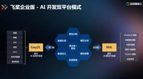 伴随着产业智能化的大潮,AI已成为诸多行业转型升级的通用技术,企业级AI开发平台的作用日益凸显。依托AI原生的云基础设施,基于百度自研的产业级开源深度学习平台飞桨,满足企业针对场景的定制化应用需求,百度推出飞桨企业版,包括面向AI应用开发者打造的零门槛AI开发平台EasyDL和面向AI算法开发者建设的全功能AI开发平台BML。