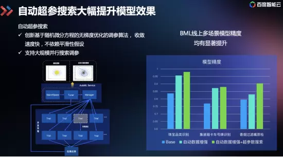 建模方式:BML提供预置模型调参、Notebook、自定义作业、可视化建模等多种建模方式。其中,预置模型调参在实现了低代码建模的基础上,具备一定的脚本编辑灵活性,同时内置了自动超参搜索功能助力提升模型效果。BML提供的自动超参搜索功能是创新基于随机微分方程的无梯度优化的调参算法,收敛速度快,不依赖平滑性假设,并且可以支持大规模的并行搜索调参。在开启自动超参搜索之后,BML线上多场景的模型精度平均可提升10%以上。