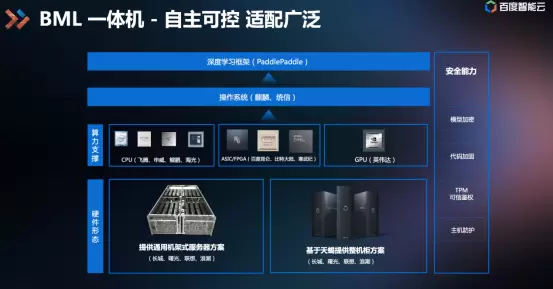 国产化的解决方案:BML全面支持从国产深度学习框架飞桨,到麒麟等国产操作系统,再到国产CPU和GPU以及长城、曙光、联想、浪潮推出的各类硬件形态,构成了自主可控、适配广泛的BML一体机,高性价比的算力资源满足各类算力需求。