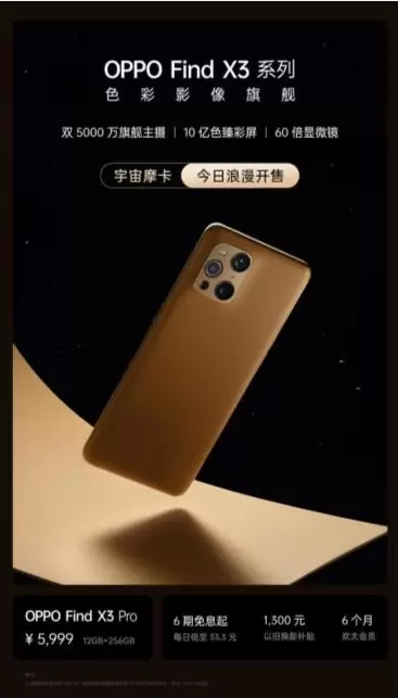 4月1日起,OPPO Find X3系列新配色宇宙摩卡全面发售,现在购买还可享受6期分期免息、1300元以旧换新补贴以及6个月欢太会员等优惠,用户可通过OPPO官方商城-欢太商城,以及京东、天猫、苏宁易购等渠道购买。