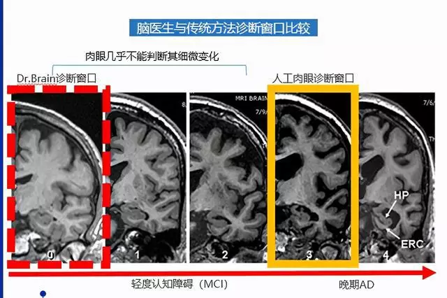 脑医生经过4年多的临床实验及应用,在神经退行性疾病领域的临床价值尤为突出。通过对大脑结构的精确分析,可以早期筛查病人患阿尔兹海默病及从轻度认知障碍转化到阿尔兹海默病的可能性,并将诊断窗口提前5-10年。