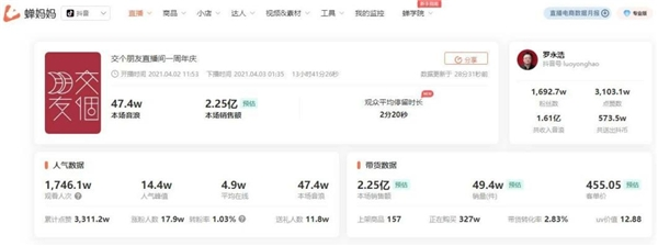 4月2日老罗一周年直播专场再创纪录,根据蝉妈妈数据显示,罗永浩4月2日的一周年直播专场,观看人数累计达1746万,人气峰值14.4万,获得音浪打赏47.4万,最终销售额2.25亿。