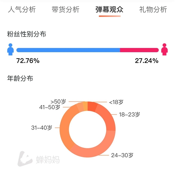 同时,这些商品与直播间的粉丝画像吻合度较高,根据蝉妈妈数据显示,老罗本场直播的男性粉丝占比超过70%,主要年龄段集中在24-30岁和31-40岁,两个年龄段均占比超过30%。