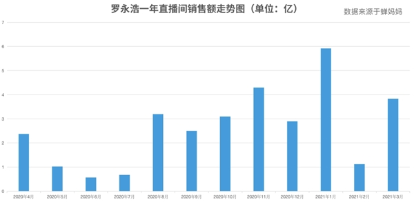 回顾罗永浩直播带货这一年,老罗创造了多个历史。根据蝉妈妈数据显示,2020年4月1日-2021年3月31日期间,罗永浩直播带货总GMV达到31.5亿,成为抖音直播当之无愧的“第一人”,领先第二名近20亿。