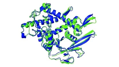 “阿尔法折叠2”预测(蓝色)和实验测定(绿色)的蛋白质结构几乎完全吻合。来源:DeepMind