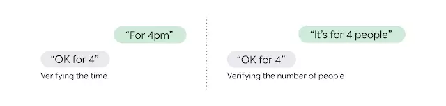 例如,如果Duplex在要求为5人的派对预订房间后面临不确定的回应,那么它将会以微小的变化重申:“嗯,5个。”这能解决接线人员的潜在困惑,同时也将一种微妙的语言标记包含在内,为谈话提供了进一步的真实感。