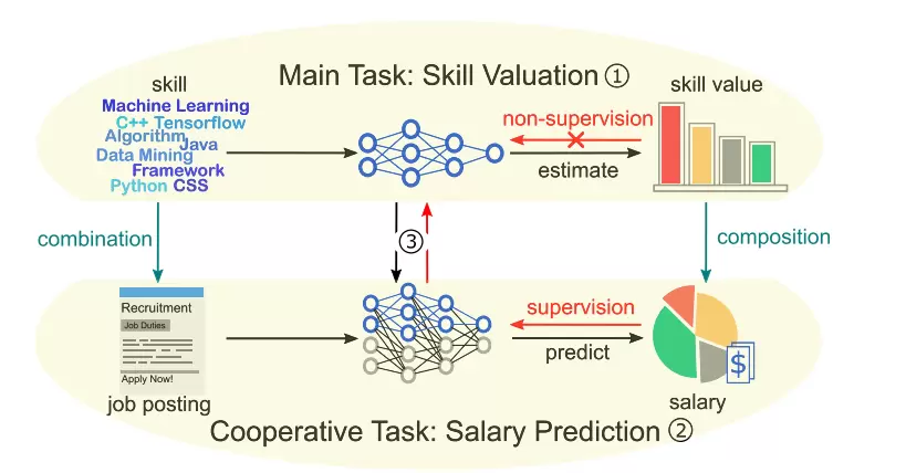 为了解决这些问题,该研究受到了“工作技能熟练度分布与工作薪资之间都存在正相关关系”这一调查结果的启发,提出了一种市场导向的技能价值定义,将技能价值表示为单独使用一项技能可以为人才带来的薪资收益。进一步地,将技能价值评估形式化为“薪资-技能价值构成问题”,并提出一种具有协同结构的薪资-技能神经网络模型(Salary-Skill Composition Network,简称SSCN)。SSCN基于神经网络算法进行建模,利用工作场景和技能间的关联性进行技能价值和技能支配性的评估,通过量化技能价值与薪资的关系将工作薪资与技能价值分离,并以大规模招聘数据中的薪资信息作为技能价值评估的间接监督信号,训练出有效的技能价值评估模型。这一做法可以有效建模工作场景对技能价值的影响,从而能够得到细粒度的技能价值估计。
