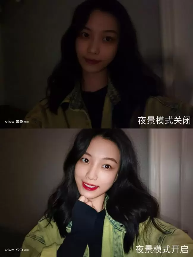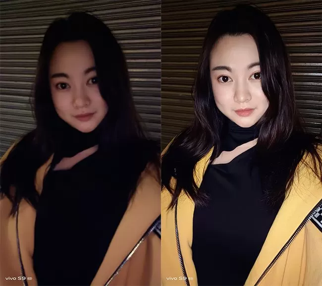 为了进一步提升在夜间自拍的效果,vivo S9从硬件和软件算法两方面开始着手。首先除了保留家族标志性的屏幕柔光环功能之外,这次vivo S9还首创了双极夜柔光灯设计。简单来说这种设计就是在屏幕和顶部边框之间嵌入了两个小巧的LED补光灯,通过物理补光的方式解决小姐姐们在晚上自拍光线不足的难题。看看下面这组自拍对比,左侧是没有任何补光措施的自拍,右侧则是开启了双极夜柔光灯之后的效果,二者的差异有多明显,相信已经不用我多说了。