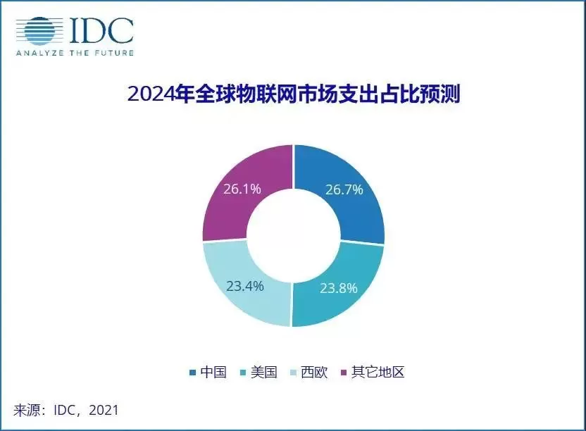 与此同时,得益于人工智能的促进,以及全球数字化、智能化创新的驱动,各界面向物联网的支出稳健增长。值得一提的是,我国是全球物联网支出最大市场,来自IDC最新报告预测,到2024年我国物联网市场支出将达到约3000亿美元,未来5年的复合增长率将达到13%,这个支出超越美国成为全球第一大物联网市场。