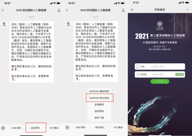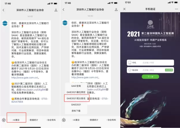 AI·人才荟也是深圳(国际)人工智能展的重量级活动。人才是国家和企业发展最核心的资源,高科技领域对人才的渴望尤为强烈。为把优秀人才焦聚到深圳,推动企业人才队伍建设,同时也为了方便求职者能找到满意的企业和岗位。主办单位深圳市人工智能行业协会将于5月21日上午举办人才交流专场活动——AI·人才荟。活动计划组织超过30家AI龙头企业,250项岗位需求,通过专业人力资源顾问进行对接,满足企业和求职者需求。具体详情可以阅读《AI·人才荟|第二届深圳(国际)人工智能展AI人才交流专场!优质企业岗位,顶尖AI人才,都在这里!》。另外,展会还有数十场“人工智能+”方向行业主题论坛以及新产品新技术发布会,涉及智慧城市、智能交通、智能医疗、智能金融、智能安防、智能网联汽车等领域。同时,还将举办深圳国际公平贸易会——全球服务贸易峰会。更多精彩,敬请期待!第二届深圳(国际)人工智能展观众报名预登记系统操作流程1. 关注“深圳市人工智能行业协会(saiia2017)”公众号,点击栏目“AI展会”,再点击子栏目“GAIE2021观众报名”,然后根据要求填写信息即可完成报名登记。