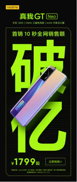 搭载天玑1200的真我GT Neo正式开售 10秒破亿终成两千档大赢家