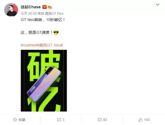 realme 副总裁、中国区总裁、全球营销总裁徐起也是在第一时间更新了微博祝贺新机首销火爆大卖,并直言称,“这,就是GT速度!”