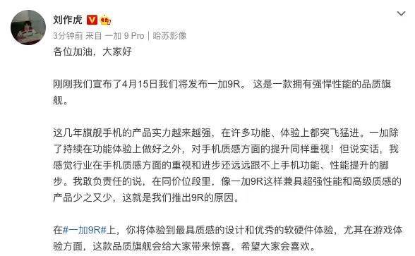 官宣:一加9R新品将于4月15日国内正式发布
