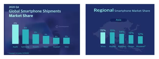 根据Counterpoint的统计数据,2020年第四季度,vivo在亚洲智能手机市场勇夺第一,15%的市场份额遥遥领先。