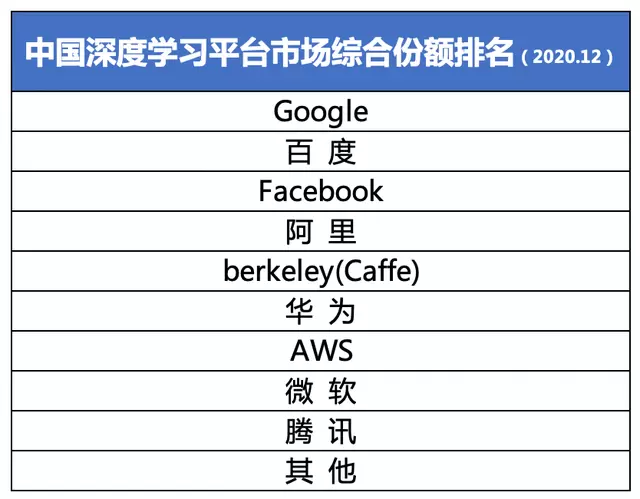 权威数据调研机构IDC公布了2020年下半年深度学习框架平台市场份额报告, 数据显示,Google、百度、Facebook稳居前三,占据70%以上市场份额。其中,百度占比提升3.38%增速第一,综合市场份额位列第二。