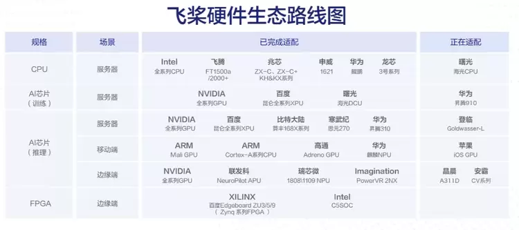飞桨还着力建起业界最为完备的硬件合作生态。作为一块“智能革命”的砖,AI必须哪里有需要就往哪里搬。所以如何“搬过去”就很关键了。飞桨全面深度适配各种人工智能硬件,除了英特尔、英伟达、ARM等诸多芯片厂商,还有飞腾、海光、鲲鹏、龙芯、申威等 CPU,并结合麒麟、统信、普华操作系统,以及百度昆仑、海光 DCU、寒武纪、比特大陆、瑞芯微、高通、英伟达等 AI 芯片深度融合。此外,还和浪潮、中科曙光等服务器厂商合作形成软硬一体的全栈AI基础设施。当前飞桨已经适配和正在适配的芯片或 IP达到 29款。