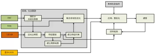 为保证清扫车能在城市环境中稳定、可靠地进行自动驾驶作业,需要融合惯性定位、卫星定位以及环境匹配定位等多种手段,实现定位方式的优劣互补。为此,深兰科技融合定位技术团队采用了基于惯性测量单元(IMU)、卫星导航(GNSS)、轮速传感器(WSS)、激光雷达(Lidar)等的多传感器融合定位方案,并根据前期大量场景的交付和技术迭代更新,提出了基于IMU/GNSS /WSS/Lidar等多传感器的紧耦合SLAM建图和定位技术,如下图4和图5所示。