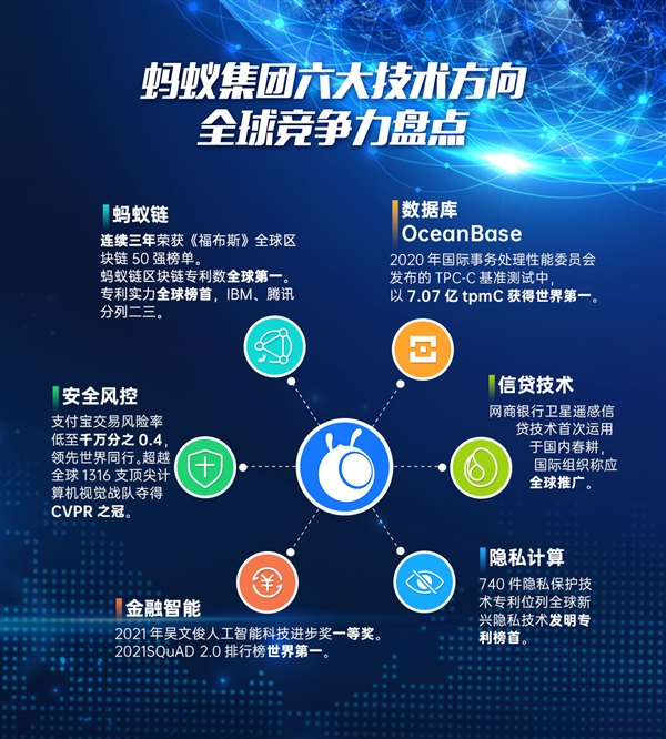 在加大培育科技实力的同时,蚂蚁集团也在积极参与国际竞争。仅今年以来就已获得多项国际殊荣,如今年2月,《福布斯》公布全球区块链50强榜单,蚂蚁链为唯一连续三年上榜的中国企业;3月,全球新兴隐私技术发明专利排行榜发布,蚂蚁集团以740件隐私保护技术专利位列榜首。