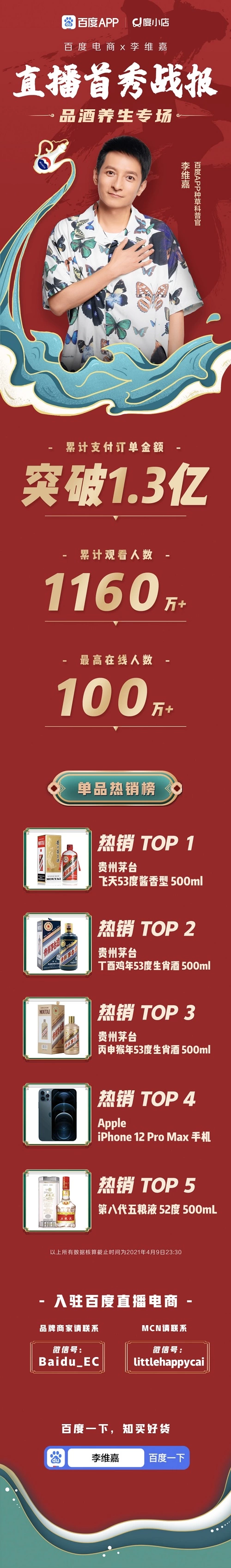 “这是我的百度首场直播,希望你们不仅买到了称心的东西,同时也玩得开心、得到满足。”4月9日晚,时长5个小时的李维嘉百度直播首秀落下帷幕,百度战报显示,本次直播累计GMV超1.3亿,累计观看人数超1160万,最高在线人数超100万,创下百度电商直播带货单场最高纪录。