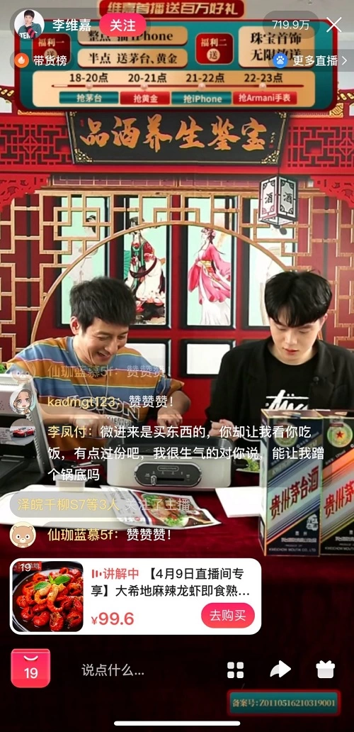 酒水品类是这场直播带货的重头戏,最终销售榜前三位均为53度茅台酒,李维嘉还现场尝试了茅台+冰淇淋的特别吃法,粉丝纷纷留言表示难以想象是什么味道。除此之外,直播过程中还送出了iPhone12、足金金条、首饰等礼品,用户互动达到最高潮。