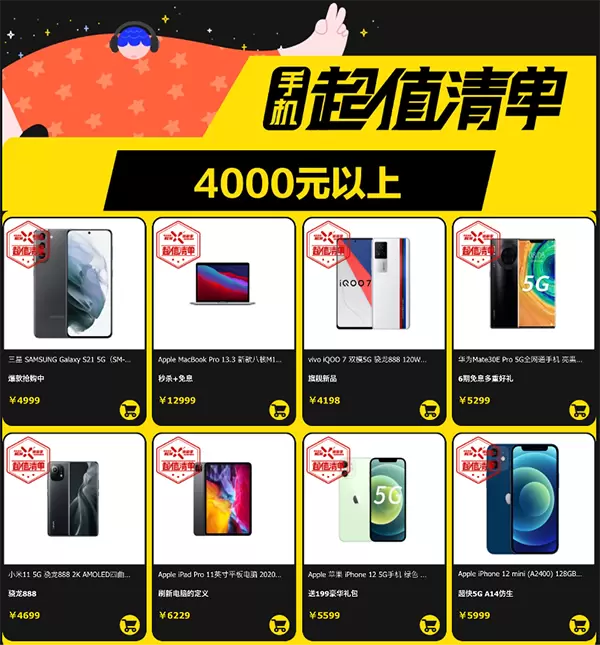 手机太多挑花眼?京东焕新季,提前为各位小伙伴列好了“超级清单”,4000元以上、3000-3999元、2999元以下,中高端档位的手机应有尽有,“按图索骥”就能找到最适合你的那一块新机。4000元以上档位,是神仙机型“打架”,vivo iQOO 7旗舰新品,4198元就能收入囊中;华为Mate 30E 多重好礼送不停;Apple iPhone12 绿色版本,下单即送199元豪礼,PD快充套装+壳膜套装不需额外购买。3000-3999元,一加 One Plus8,小众性价比之王立减300元,荣耀30 带你享受50倍变焦清晰。2999元以下的中坚机型,更多有无数手机展示,Redmi K40爆款抢购就能获赠碎屏险服务;vivo iQOO Z3限时优惠100元,畅快游戏就是这么简单。