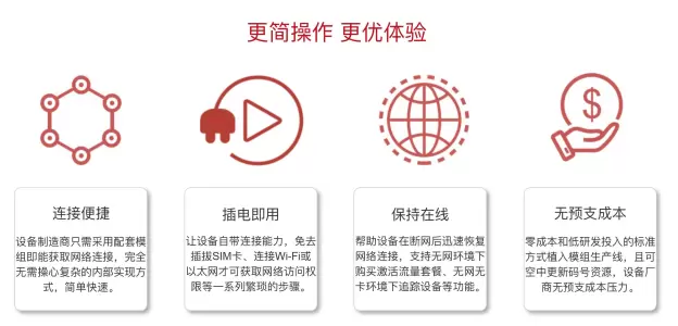 简单来讲,客户只需采用已集成 RedteaReady 的配套模组或标准 API, 即可轻松获取数据网络连接, 随时随地联网,并且可以通过用户控制台实时查看和管理所拥有的设备及订单, 无需再为与网络连接相关的复杂繁琐的实现方式操心。