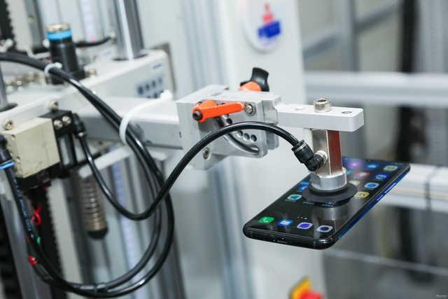 举个简单的例子:为提升充电口抗腐蚀性,vivo要求在充电口滴入汗液后进行近6000次的插拔试验,不允许有充电失效,这就是严苛的质量标准。在人体坐压环境测试中,自动化设备将30KG的重力对手机做1000次施压;在对机身进行扭动测试时,像拧麻花一般对手机机身上下端施加300次一个扭矩单位的力;经过这些“严刑”后,在200倍(极端测试2000倍)显微镜下审视主板和芯片没有裂纹才可以通过。