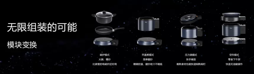 这个设问助产了Quick系列当中被美的称为其成立53年以来推出的首款烹饪“玩具”——QuickMore集成烹饪中心,整机采用模块化设计,可以更换组合上盖或机身来实现在电磁炉、煮锅、压力锅、空气炸锅四大形态中的切换。而且还可以通过IoT互联将美的美居APP内的新增功能及食谱下载到产品本体中,自定义本机专属功能。未来还可搭载集成搅拌上盖变身智能炒菜机,或配合专属透明玻璃锅实现可视化美食烹饪,拓展机器的更多玩法。