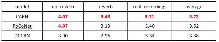 该数据集中,亚马逊PoCoNet模型、西北工业大学和搜狗合作的DCCRN模型等在具有混响的仿真场景和真实场景下,只能得到中等品质的音频;相比之下,云从CARN模型在各类场景下均有优秀表现,无论是没有混响的仿真场景(no_reverb)、还是具有混响的仿真场景和真实场景下,都能大幅减少音频中的噪音,处理取得清晰的优质音频,提升音频的清晰度。