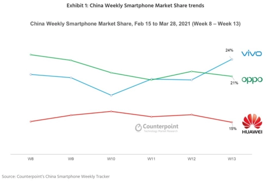 数据显示,在2021年的第11周(3月8日至14日),vivo在中国的市场份额达到24%,紧随其后的OPPO份额为21%,华为则是15%。