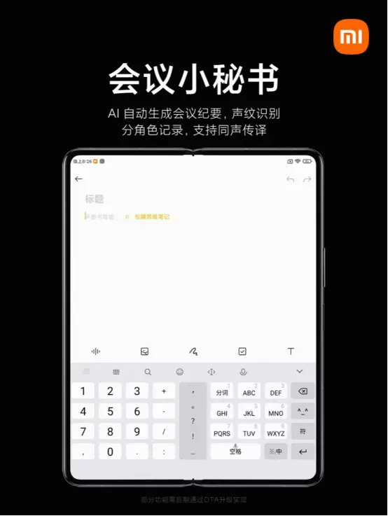 大屏只是为移动办公提供了硬件支持,软件方面,小米折叠屏MIX FOLD同样遥遥领先。内置掌上PC模式,不仅可以让你随意浏览文件、图片、文件夹、APP等,还可以让你根据心情自由调节它们的位置;AI会议助手功能,可以通过先进的AI算法,对不同参会人的发言内容进行自动识别和记录,精确程度不输于专业速记。面对多语言环境,小米折叠屏MIX FOLD还可以同步完成英汉互译甚至其他语种的翻译。