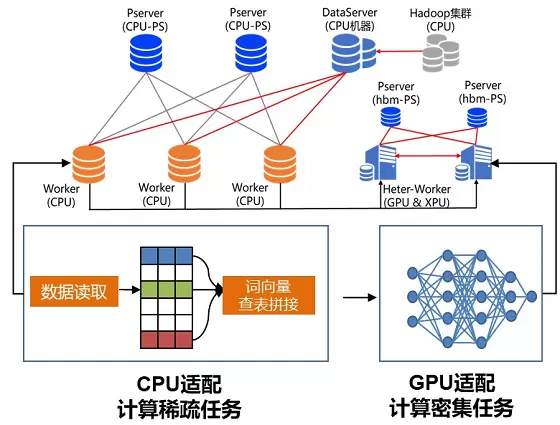 基于这两种解决方案,飞桨框架 2.0 版本创新性地推出了通用异构参数服务器功能。一举解除了传统参数服务器模式下,Worker 节点必须严格使用同一种硬件型号的枷锁,使训练任务对硬件型号不敏感,即可以同时使用不同的硬件混合异构训练,如 CPU、AI 专用芯片(如百度昆仑 XPU)以及不同型号的 GPU 如 v100、P40、K40 等。同时还可以解决大规模稀疏特征模型训练场景下 IO 占比过高导致的芯片资源利用率过低的问题。通过异构参数服务器训练模式,用户可以在硬件异构集群中部署分布式训练任务,例如云服务器集群,高效利用不同算力芯片,为用户提供更高吞吐、更低资源消耗的训练能力。