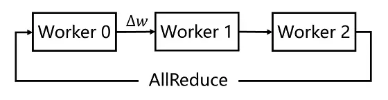 但是在早期的集合通信架构中,多节点间的参数信息的传输通常是各个 Worker 之间多次点对点通信完成的,通讯效率较低。百度在 2016 年突破性地提出并使用 Ring-AllReduce 多 GPU 训练,通过较少的点对点通信轮数就完成了全局节点的模型参数传输,让同步并行训练的多 GPU 扩展能力得到极大突破,大幅提升集合通信模式的训练速度,使这种模式在 NLP 和 CV 领域得到更广泛的应用。