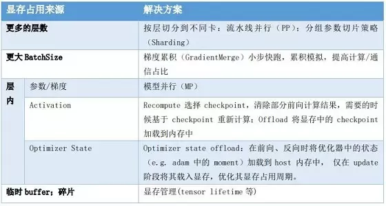 其次看显存问题,通过下表分析的显存占用来源可以看出,上述的并行策略同样可以很好地应对不同来源的显存占用,更多的层数可以通过流水线并行和分组参数切分策略来解决;某层参数很大可以通过模型并行来解决;其次飞桨还提供一些其它灵活的优化方式,例如每层输出占用的显存,可以通过重计算和 Offload 来解决。