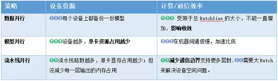 其中单卡速度由数据读取和计算速度决定;多卡加速比由计算/通信效率决定。显而易见,这三个是关键因素。除了单卡可以使用的算子融合、混合精度之类的基础性能优化策略之外,分布式训练还引入一系列并行策略。并行策略的核心思想是将数据和计算有关的图 / 算子切分到不同设备上,同时尽可能降低设备间通信所需的代价,合理使用多台设备资源,实现高效的并发调度训练,最大化提升训练速度。常见并行策略有数据并行DP(Data Parallel)、Layer 间并行(流水线并行 PP,Pipeline Parallel)、Layer 内并行(模型并行 MP,Model Parallel)。如下表所示。我们从设备资源和计算/通信效率来分析三种策略的优缺点: