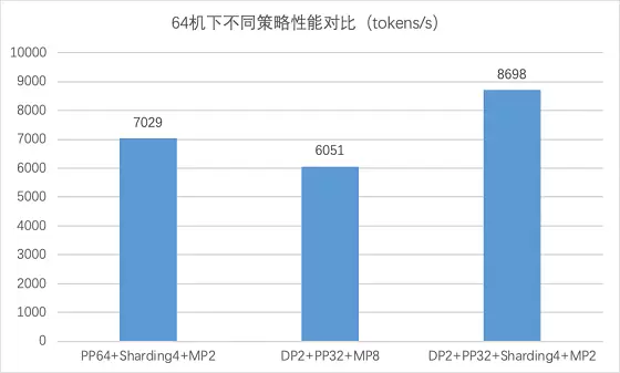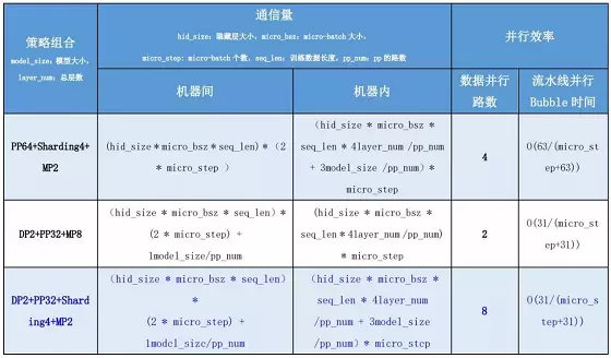 最后我们从理论性能角度对比分析了几组混合并行策略,即 DP2+PP32+Sharding2+MP4、PP64+Sharding2+MP4 和 DP2+PP32+MP8。如下表所示,与两种 3D 方式相比,4D 混合并行策略在通信量和 Bubble 时间上并未明显增长(具体公式推导和示例请参见相关教程),但是大幅提升了数据并行路数!