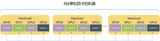 举个例子,假设用户有 4 台单机四卡的机器(共 16 张卡),训一个 16 层网络的模型。如果模型参数规模可以使用一台机器承载,则推荐使用 dp_degree=4 & sharding_degree=4 的方式,如图 11 所示。这种方式的优势在于只有机器内卡间通信,但是模型最大不能超过单台机器所能承受存储范围。