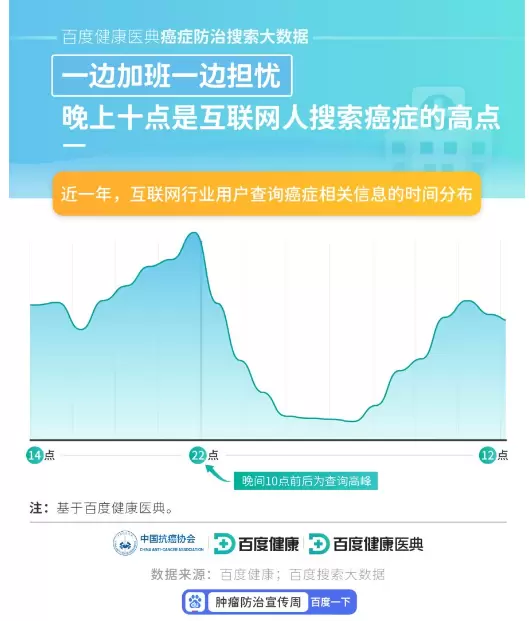 边忙碌边担忧,这样的状态会反映在互联网人查询癌症相关信息的时间分布上。百度搜索大数据显示,晚间十点是互联网人的癌症搜索高峰。在这个时间段,可能终于到家,或尚在伏案工作。一天过去,健康议题终于挤入了他们的视野。